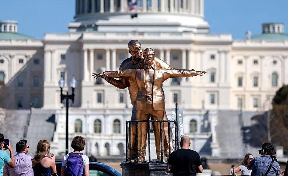La pieza, titulada “King of the World”, fue instalada por el colectivo artístico anónimo The Secret Handshake, conocido por realizar intervenciones satíricas en espacios públicos. La escultura incluye placas con comentarios críticos sobre la relación entre ambos personajes.