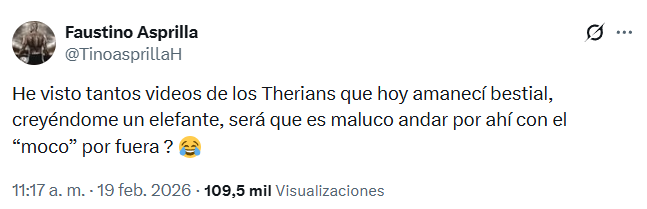 En su cuenta de X escribió: “He visto tantos videos de los Therians que hoy amanecí bestial, creyéndome un elefante, ¿será que es maluco andar por ahí con el ‘moco’ por fuera? 😂”.